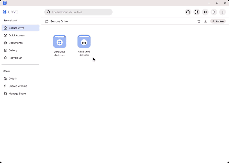Within the 'Drive Session', users can seamlessly add and encrypt connected storage devices. They have the option to designate access to specific Zunu user IDs or utilize a default passkey created by Zunu Drive, which can be shared at the user's discretion.