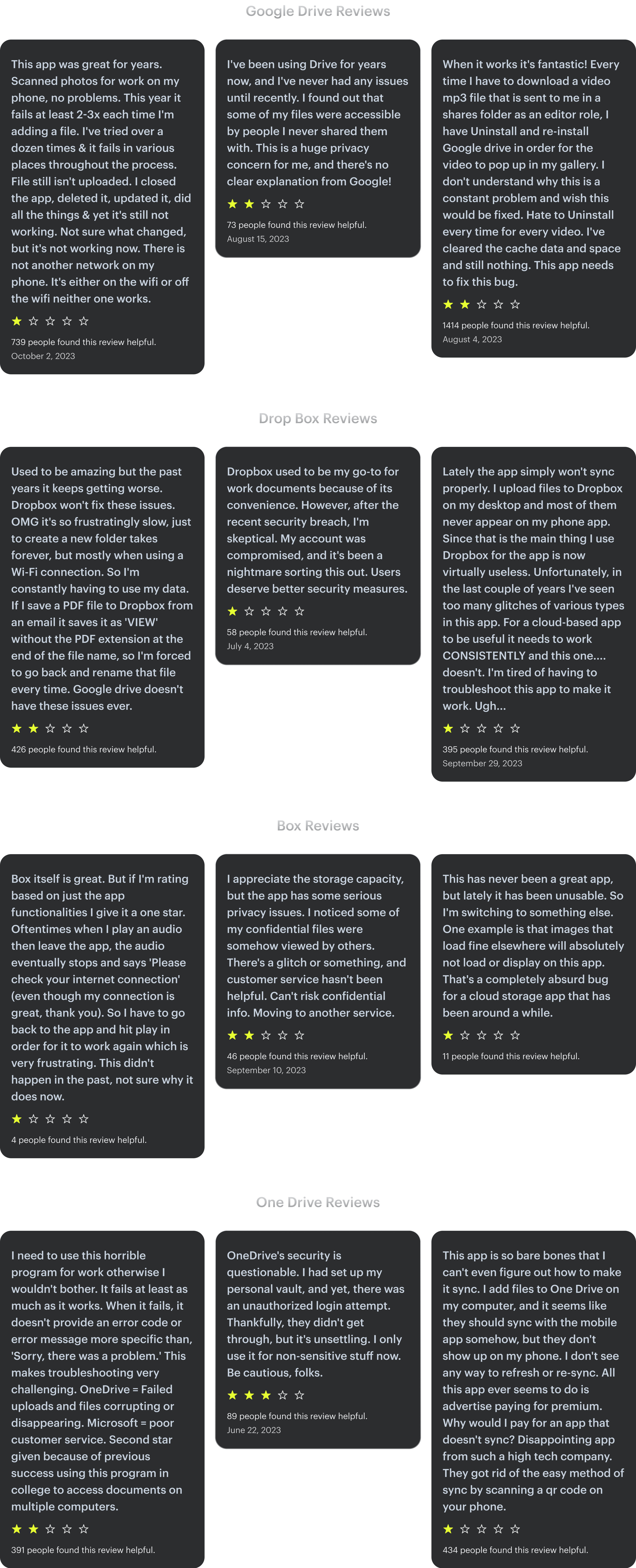 In my journey to shape Zunu Drive's place in the market, I knew I needed a clear picture of the landscape. So, I turned to the real-world experiences of users, diving into reviews on the Play Store and Apple Store for our competitors: Google Drive, Dropbox, Box, and OneDrive. Here's the insight I gathered: